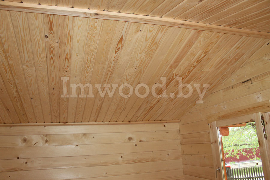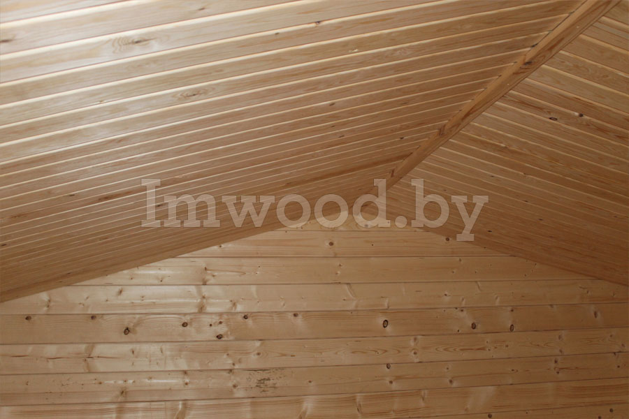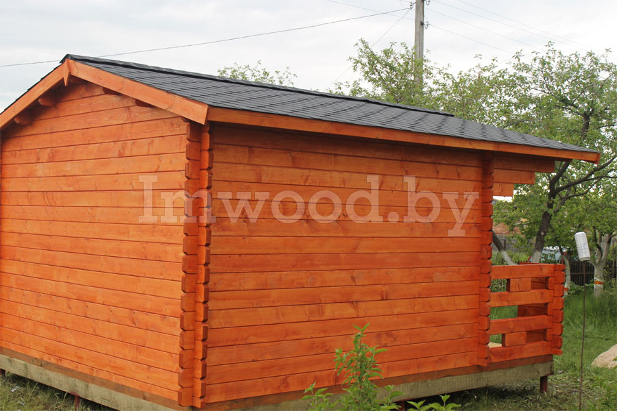 По желанию заказчика мы произвели монтаж утеплителя пола и потолка, покрасили домик в цвет красное дерево, произвели подшивку потолка вагонкой сорта АБ и монтаж кровли из гибкой черепицы.