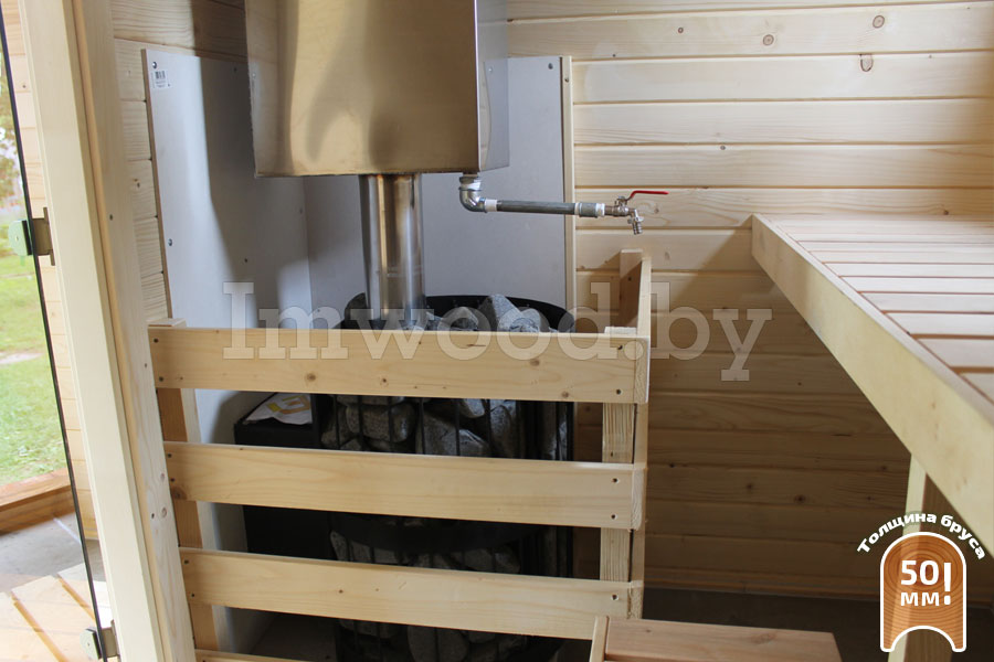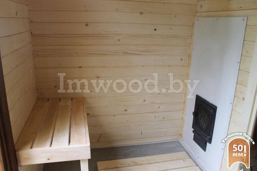 Баня изготовлена и установлена для нашего заказчика из Могилева. Внутри 2 помещения и терраса, установлена печка с выносной топкой из предбанника. Цвет — дуб. Кровля красная.