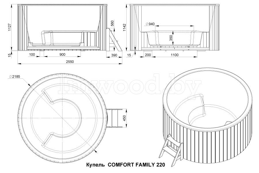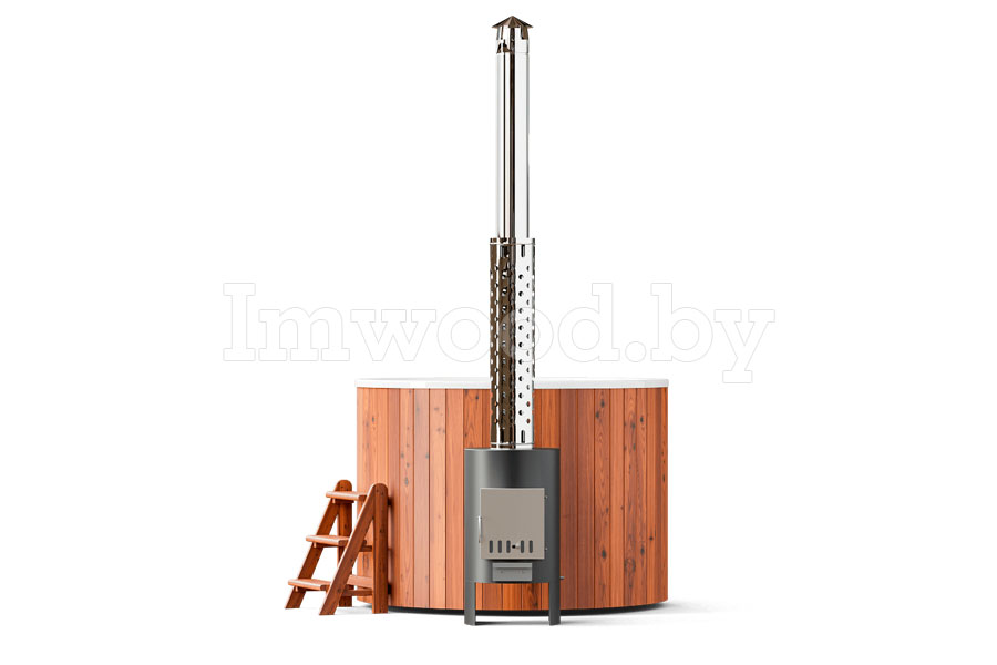 Купель оборудована сидением, внутренней лестницей и приставной наружной лестницей.