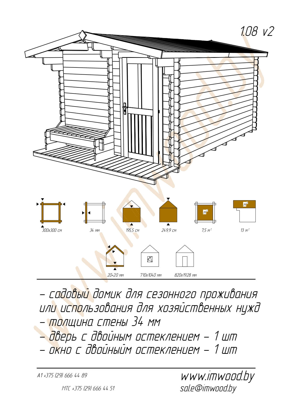 Дачный домик 1.08, размер 3х3м - изготавливается из профилированного бруса технической сушки и после возведения у Вас на участке – полностью готов к использованию.