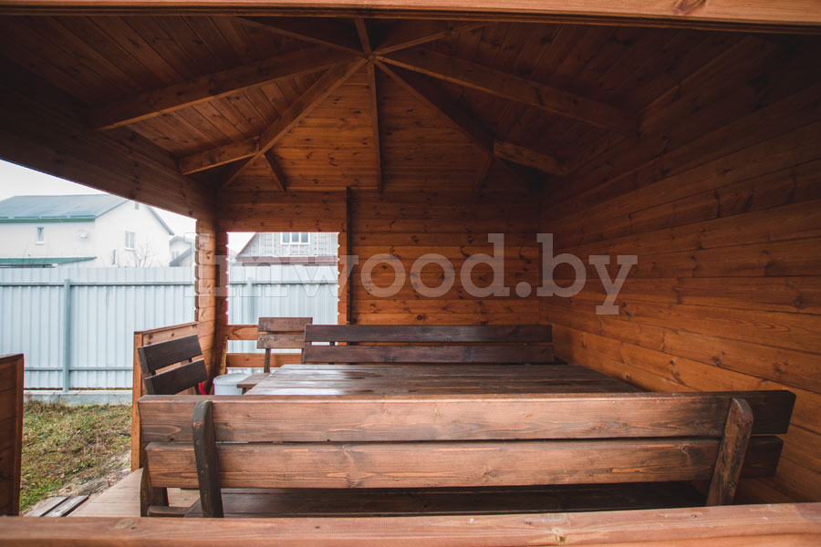 Пол в беседке – деревянный по лагам, толщина доски 20 мм. Кровля выполняется, как правило, из гибкой черепицы Шин Глас.