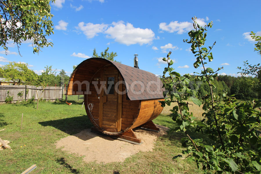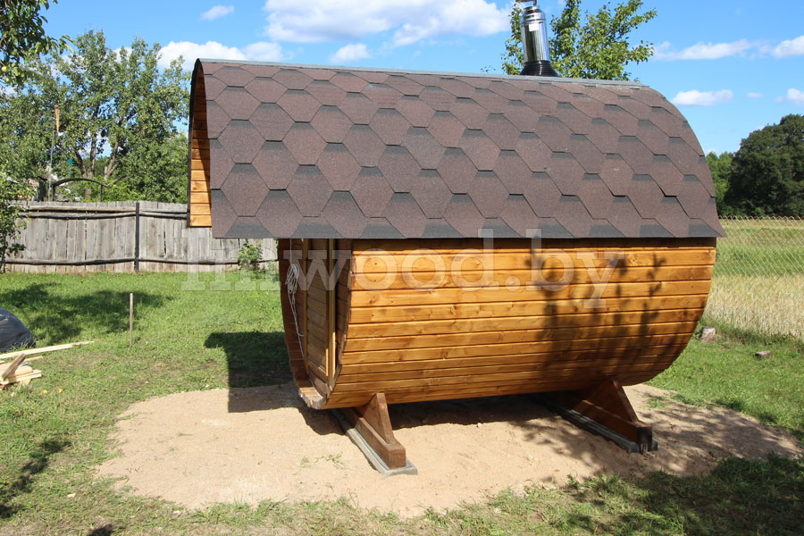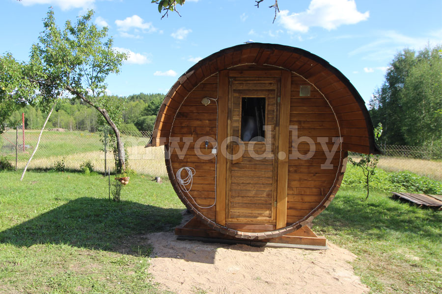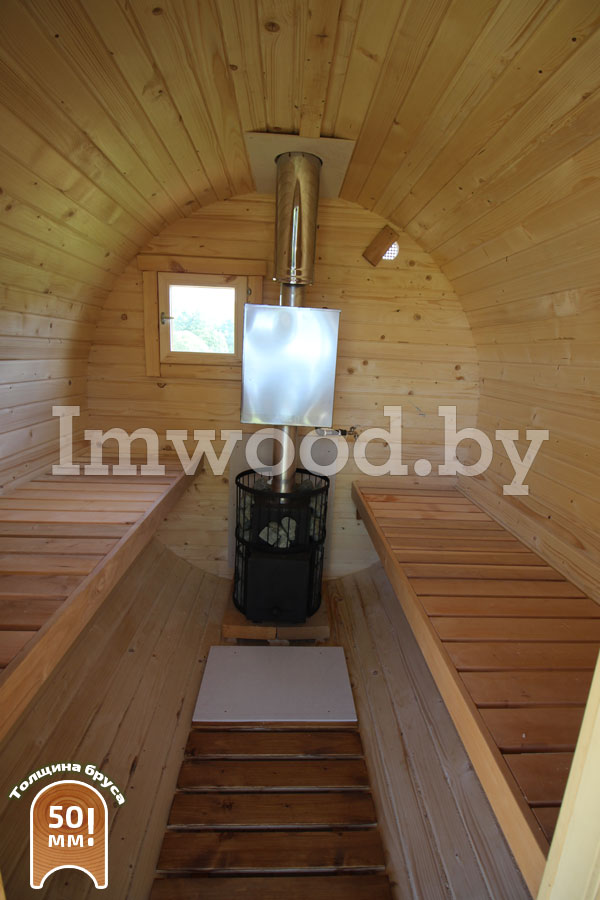 Обратить внимание стоит на тот факт, что хоть длина бани и небольшая, диаметр ее 2,25 метра. Тапкой же, как и в моделях большей длинны, что позволяет комфортно находится внутри.
