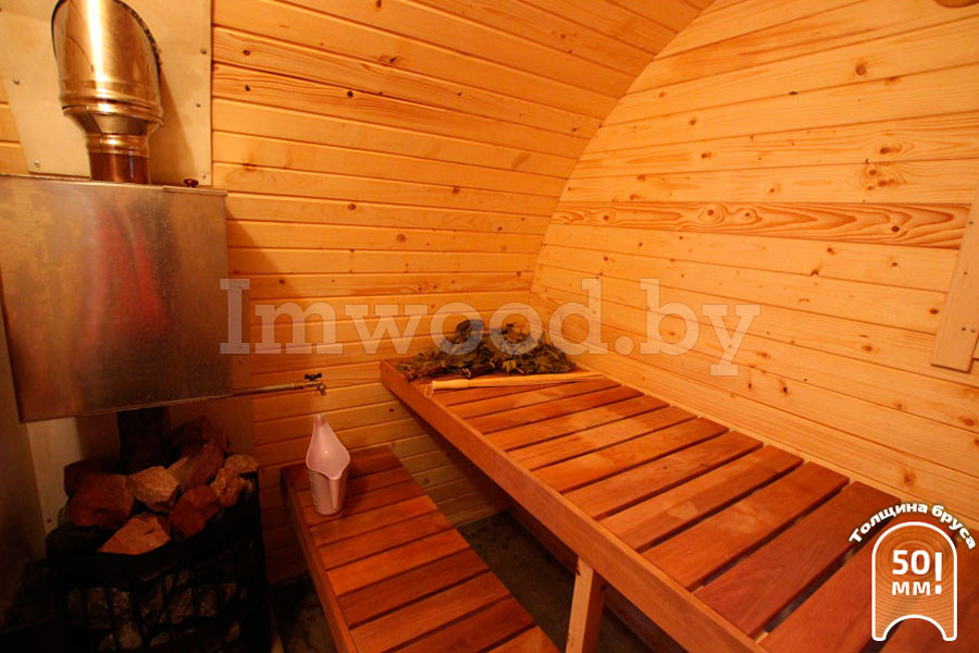 Помещение парной прогревается моментально благодаря мощной печи на дровах либо электропечи.