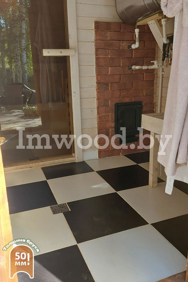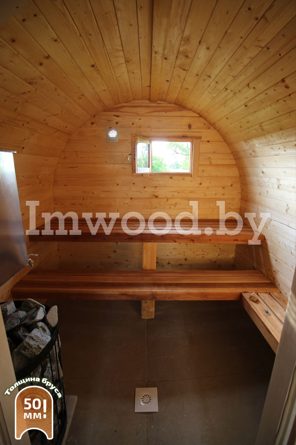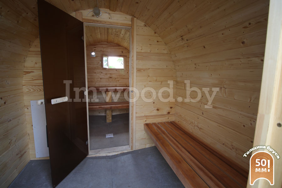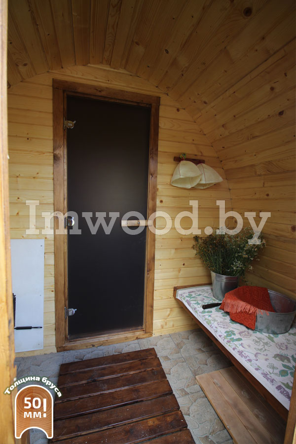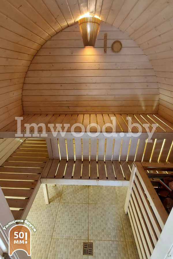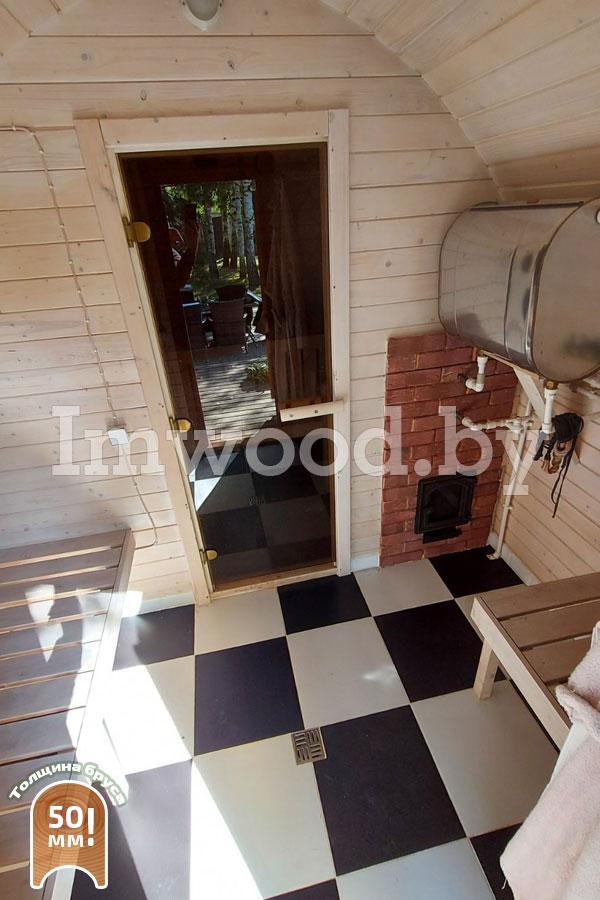 Важным нюансом арочной бани является конструкция пола с небольшим уклоном для возможности укладки кармической плитки, что в конечном итоге продлевает срок службы всего изделия и позволяет сделать эксплуатацию максимально простой и легкой.
