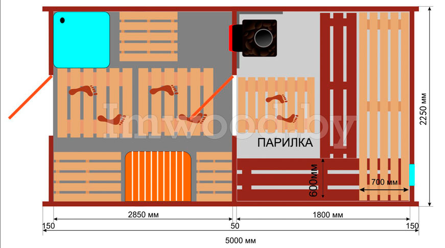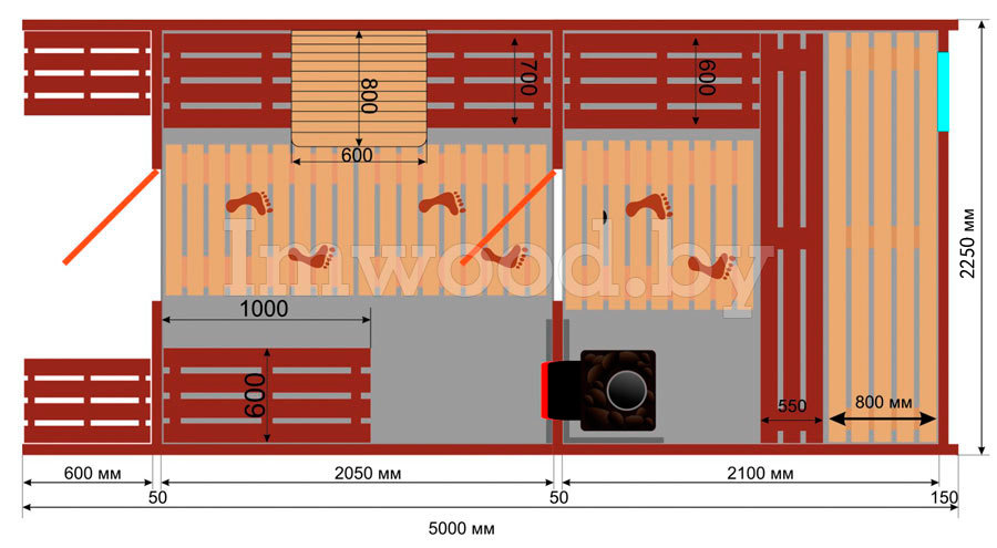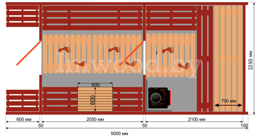 Помещение парной прогревается моментально благодаря печи на дровах, при этом топиться печь может как из предбанника, так и из парной.