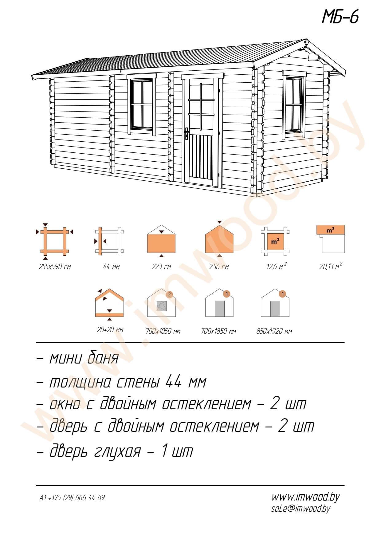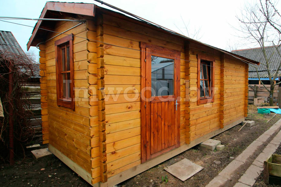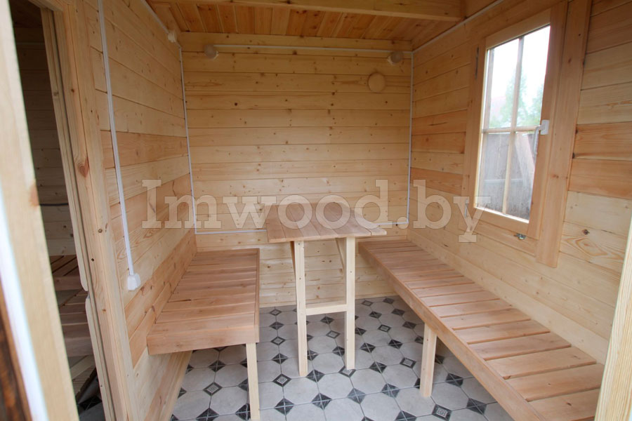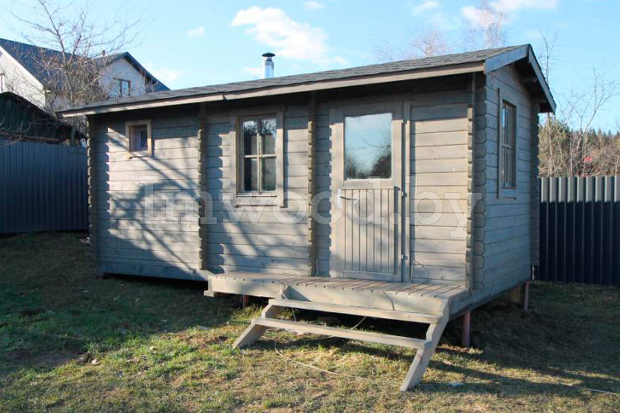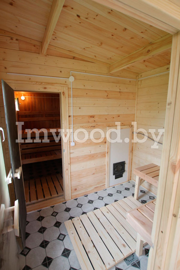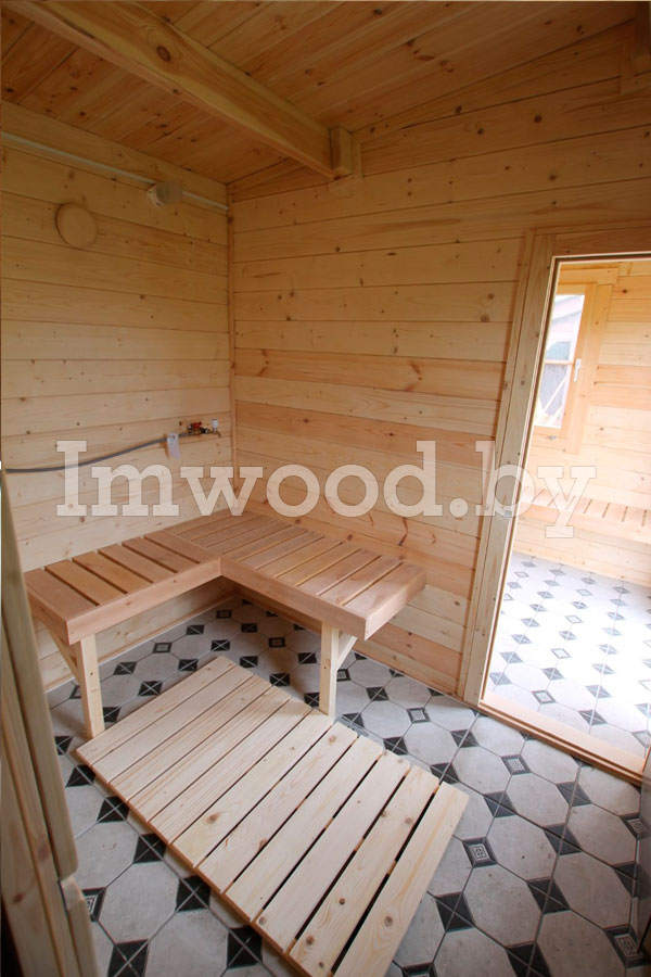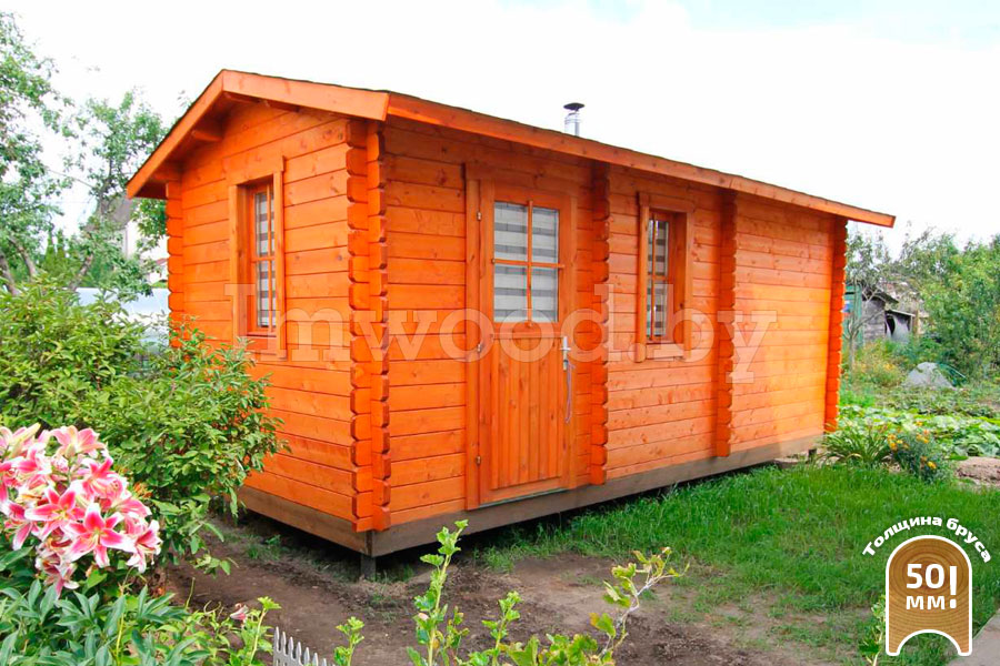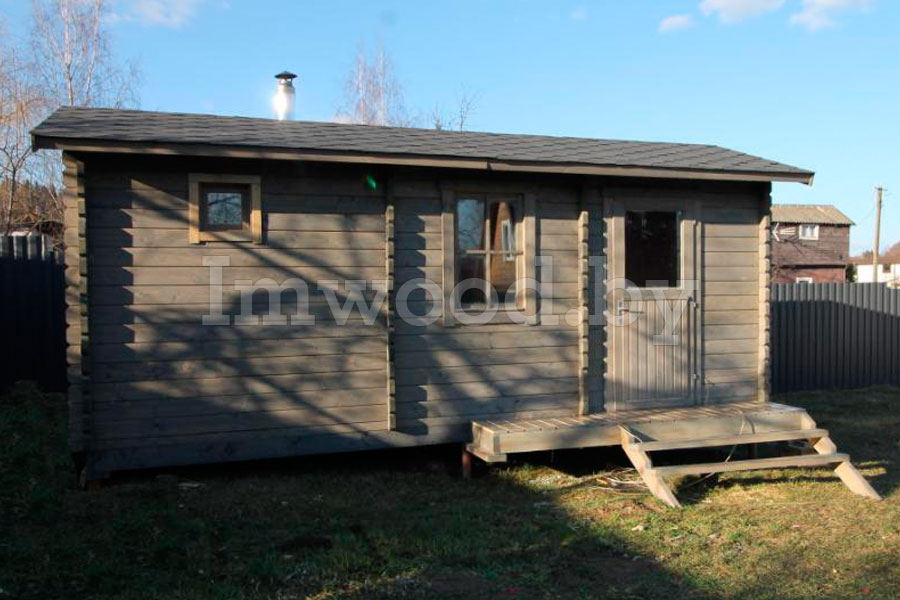 Баня произведена из профилированного бруса 44х145мм с двойным шипом и зарезанными чашами, помещение парной выполнено по каркасной технологии с утеплением и пароизоляцией из фольги. Брус изготовлен из древесины северных регионов Беларуси. Сборка осуществляется с помощью непродуваемых ветровых замков, которые обеспечивают надежность и устойчивость конструкции.