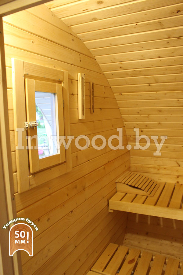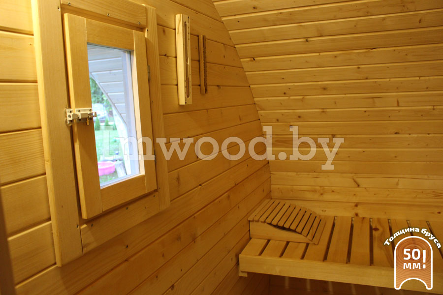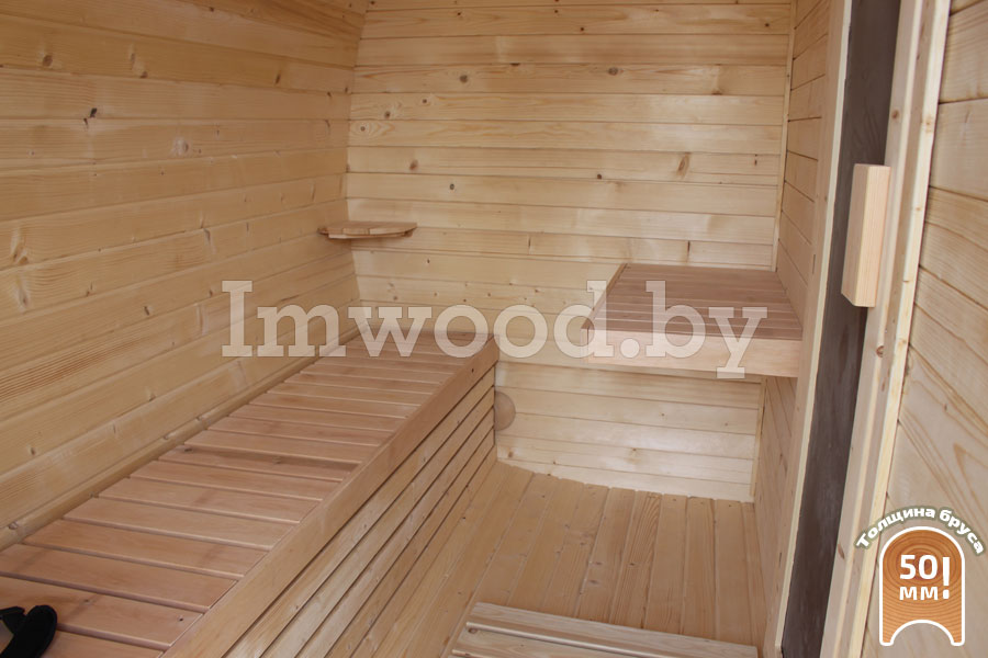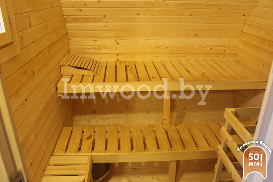 Толщина бруса 50мм - в отличии от конкурентов мы не экономим на таком важном параметре, как толщина стенки из отборной еловой древесины влажностью 7-8%. Еловый материал содержит очень мало смолы, имеет низкую плотность – тем самым комфортен при высокой температуре.