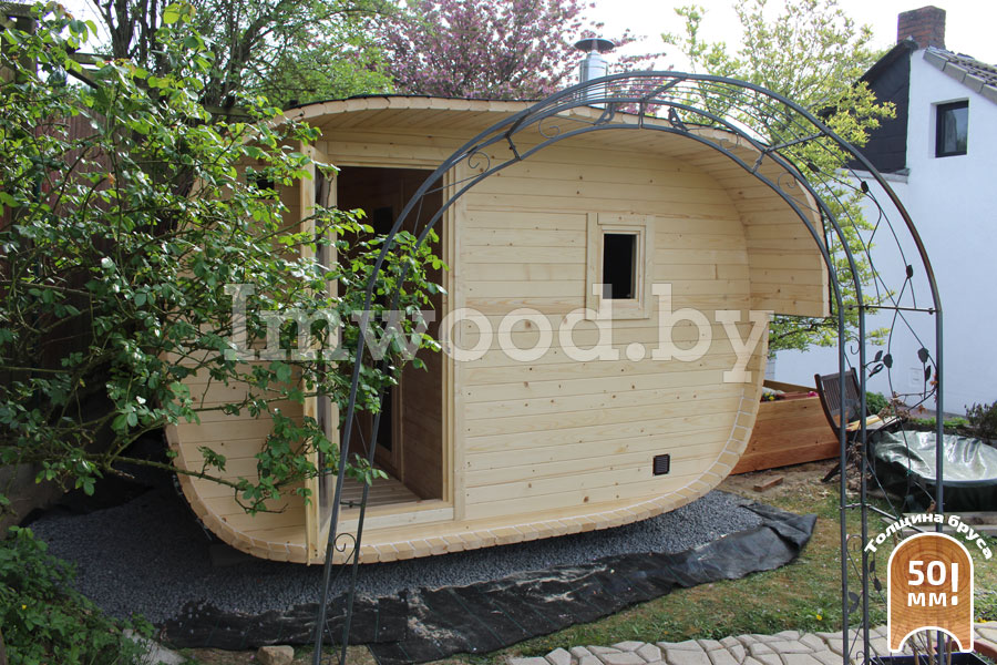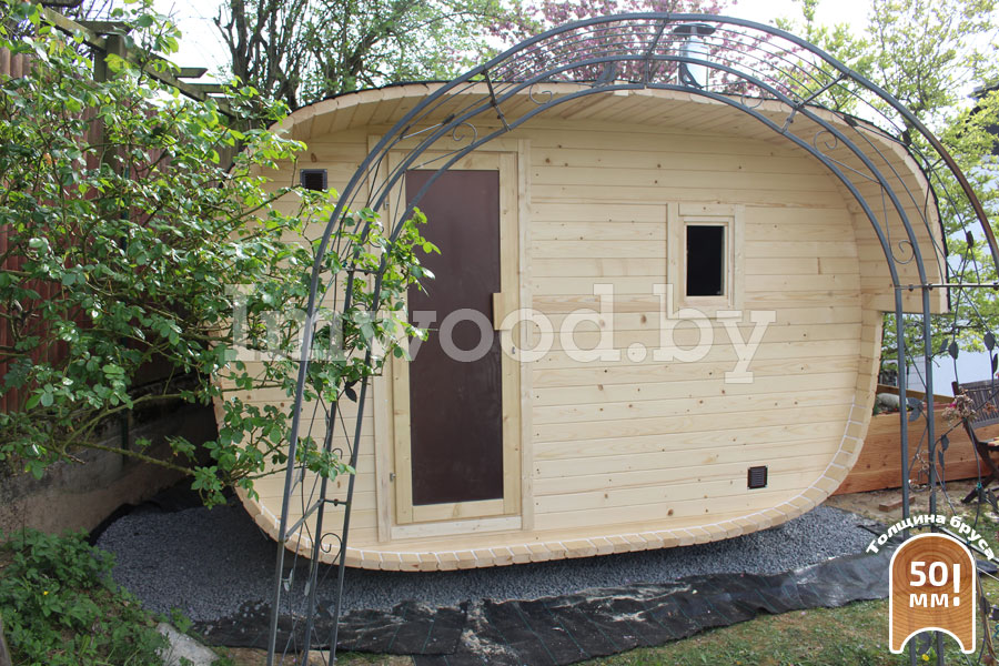 Баня в форме овала – это уникальный, продуманный дизайн готовой бани. Интересное решение выполнено в виде крыльца, которое придает оригинальный вид, а также имеет функцию беседки. Такая баня станет отличным предметом экстерьера на Вашем участке!