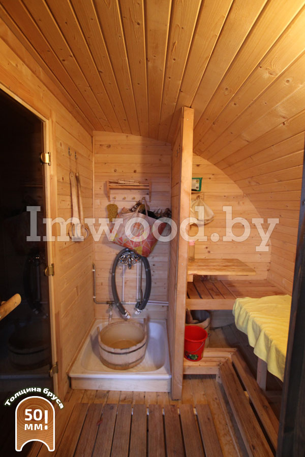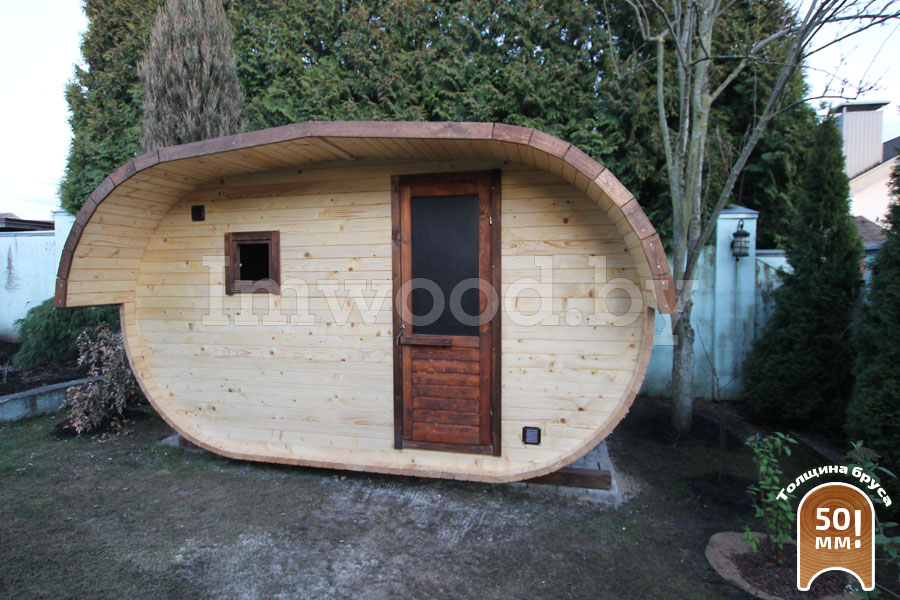 Баня в форме овала – это уникальный, продуманный дизайн готовой бани. Внутри смонтирован душевой поддон, а также есть возможность установки бойлера для нагрева воды. Такая баня станет отличным предметом экстерьера на Вашем участке!