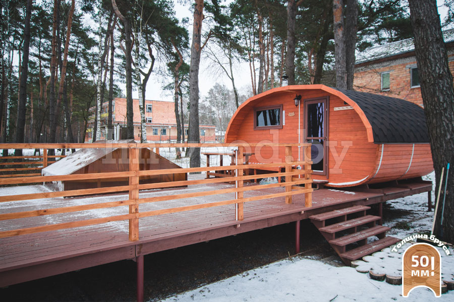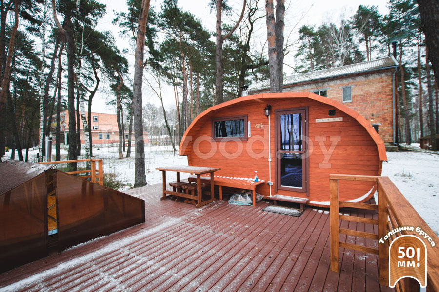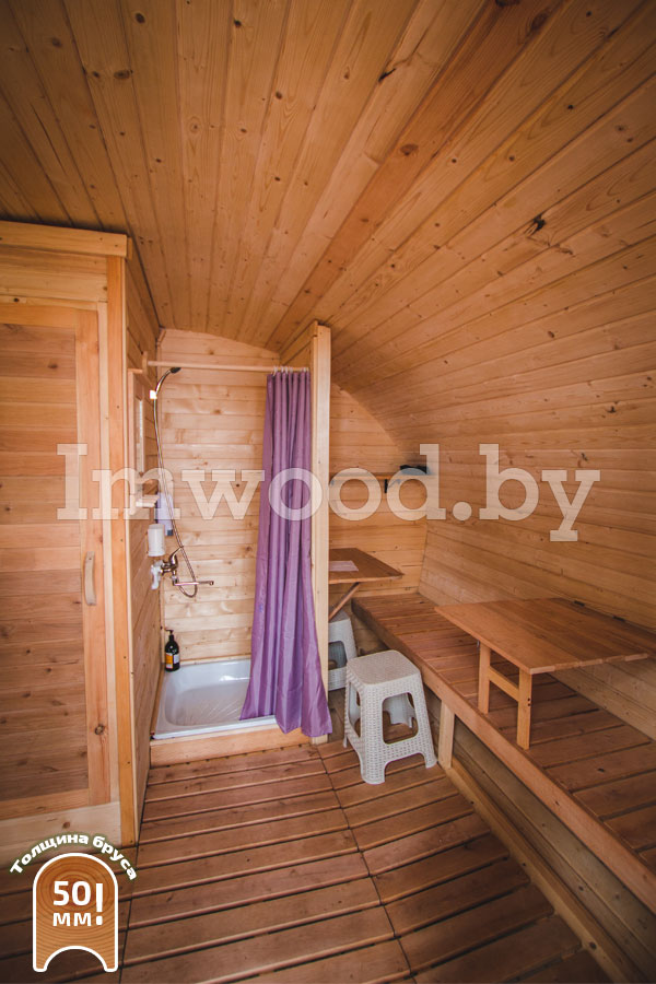 Баня в форме овала – это уникальный, продуманный дизайн готовой бани. Интересное решение выполнено в виде крыльца, которое придает оригинальный вид, а также имеет функцию беседки. Внутри смонтирован душевой поддон, а также есть возможность установки бойлера для нагрева воды. Такая баня станет отличным предметом экстерьера на Вашем участке!