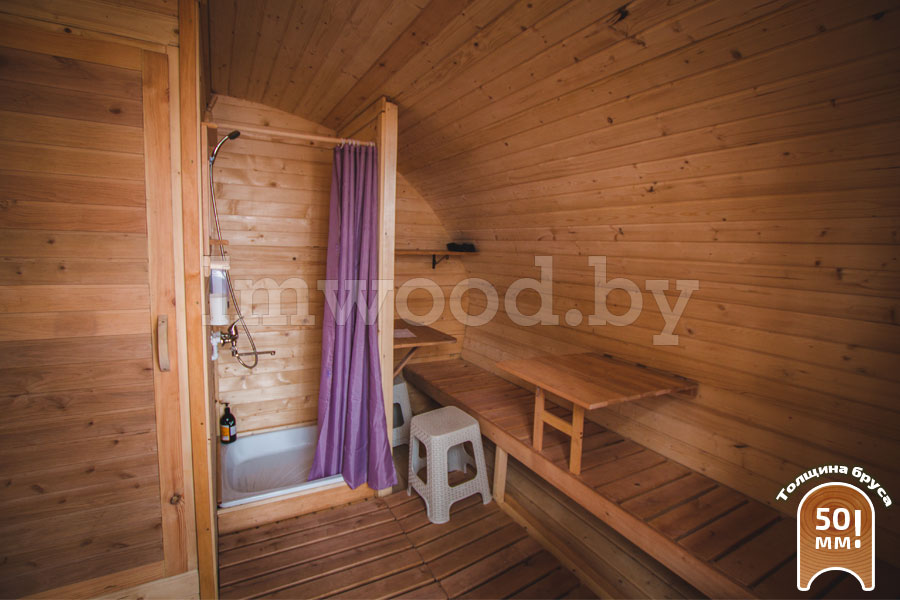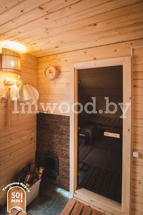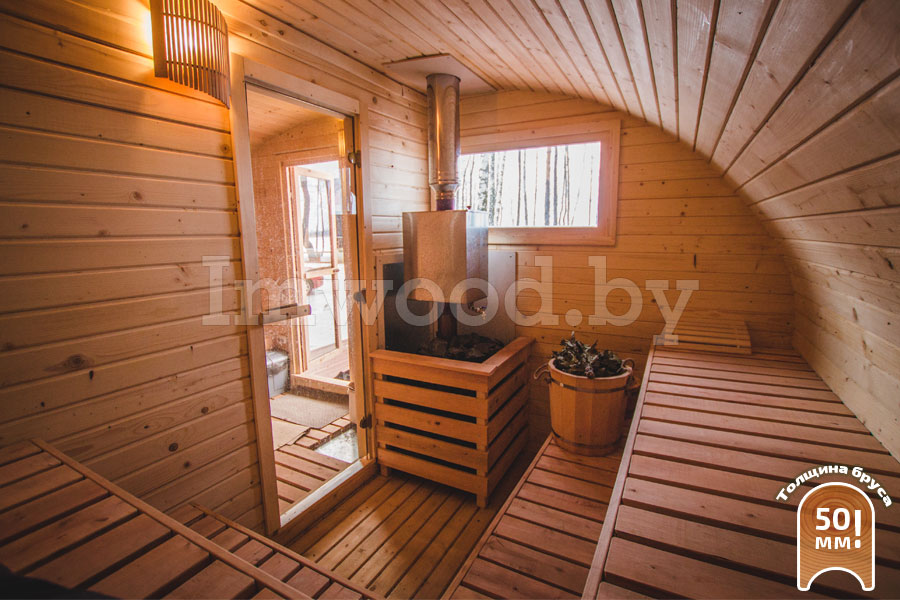 Толщина бруса 50мм - в отличии от конкурентов мы не экономим на таком важном параметре, как толщина стенки из отборной еловой древесины влажностью 7-8%. Еловый материал содержит очень мало смолы, имеет низкую плотность – тем самым комфортен при высокой температуре.
