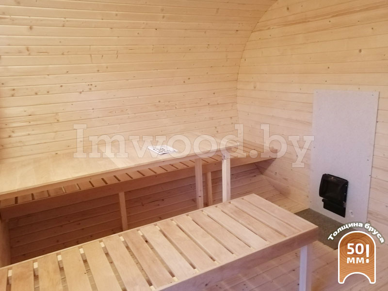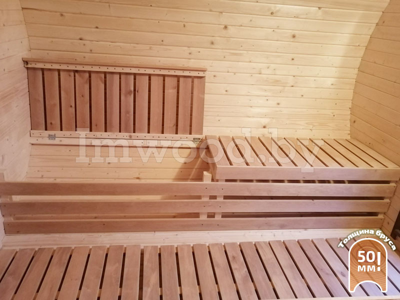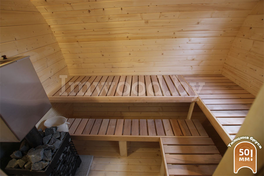 Толщина бруса 50мм - в отличии от конкурентов мы не экономим на таком важном параметре, как толщина стенки из отборной еловой древесины влажностью 7-8%. Еловый материал содержит очень мало смолы, имеет низкую плотность – тем самым комфортен при высокой температуре.
