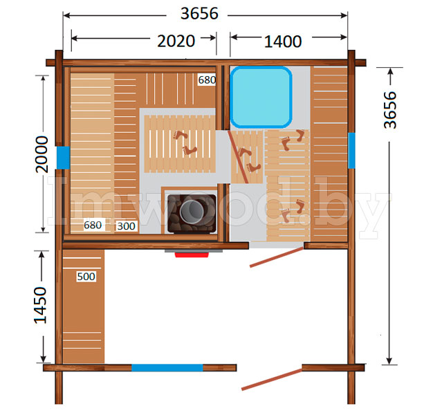 - Малый расход дров. Такой проект в виду каркасной и утепленной парной -долго держит тепло и не требует много дров.