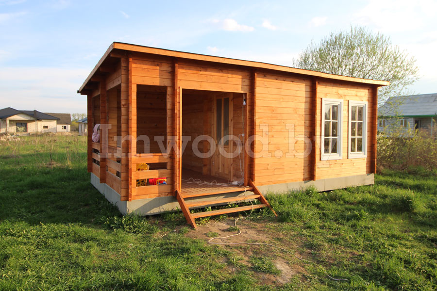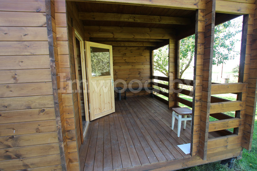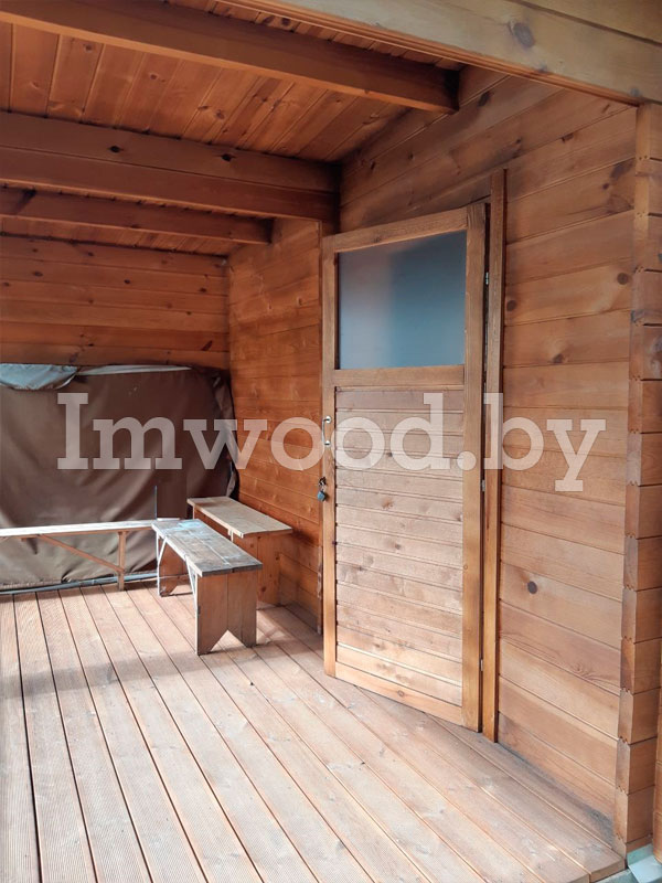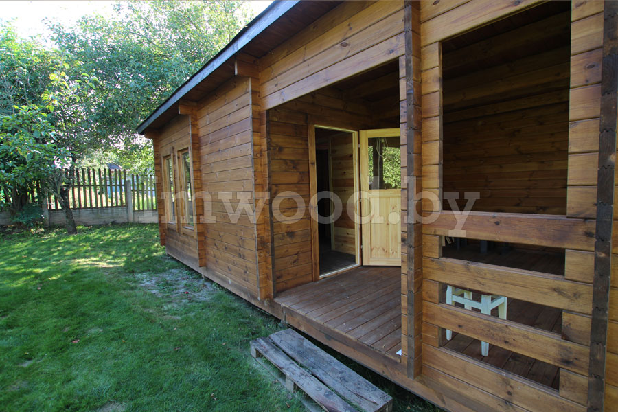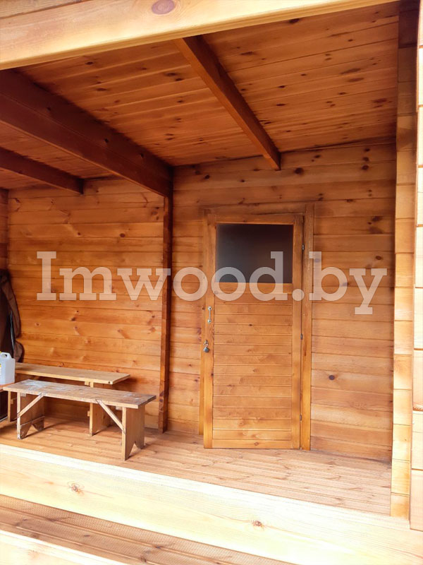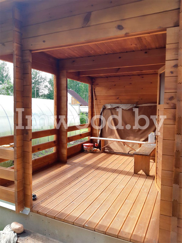 Широкие свесы крыши и крытая терраса надежно защищают стены строения от осадков, что в значительной степени повышает общий срок службы изделия.