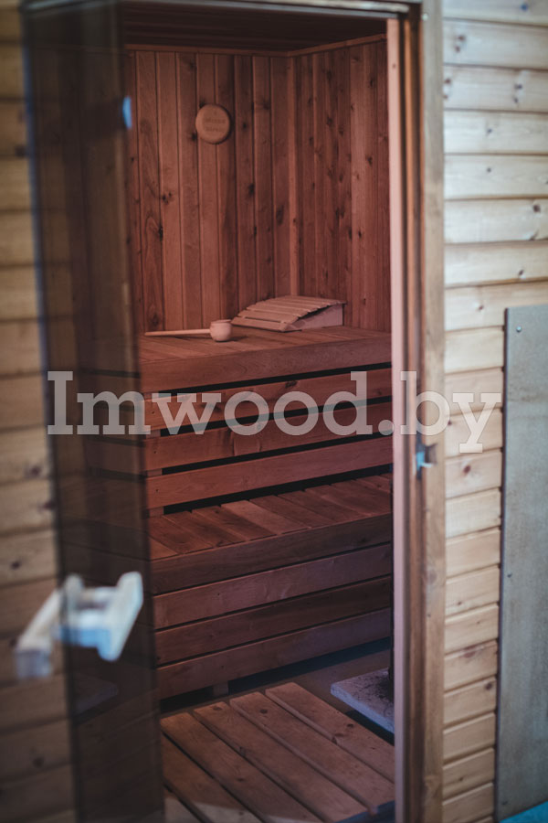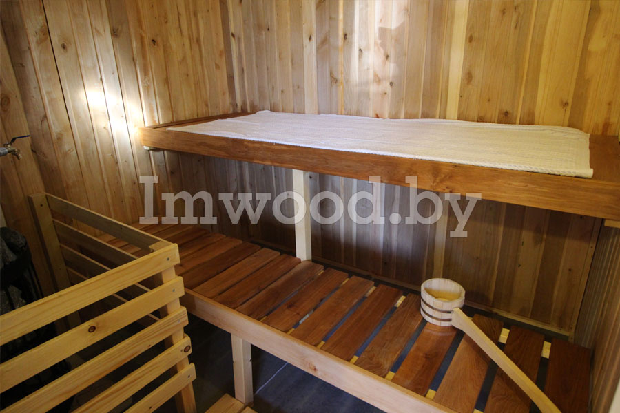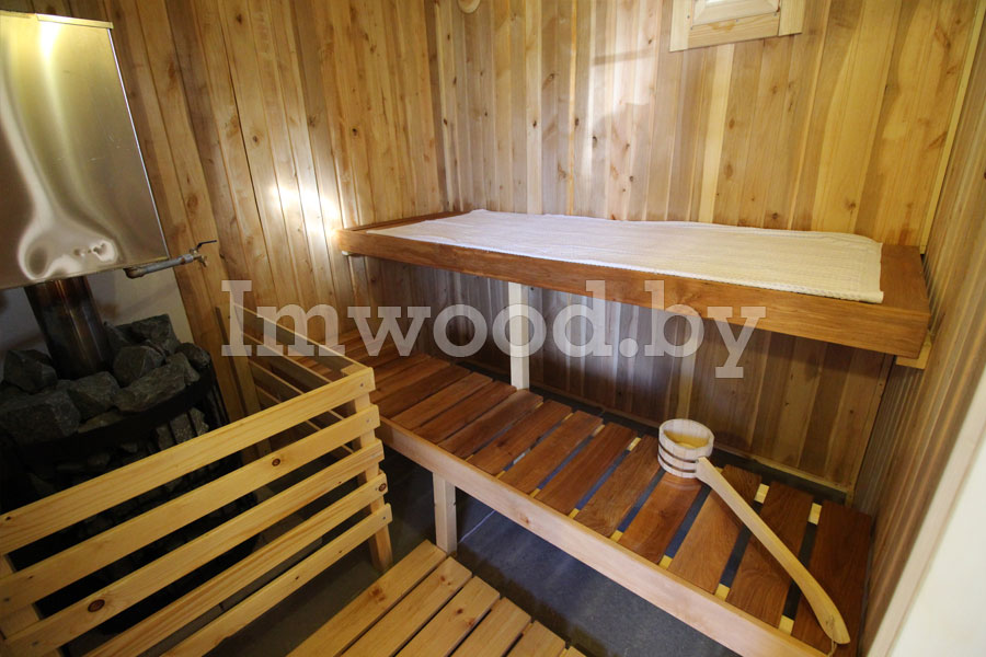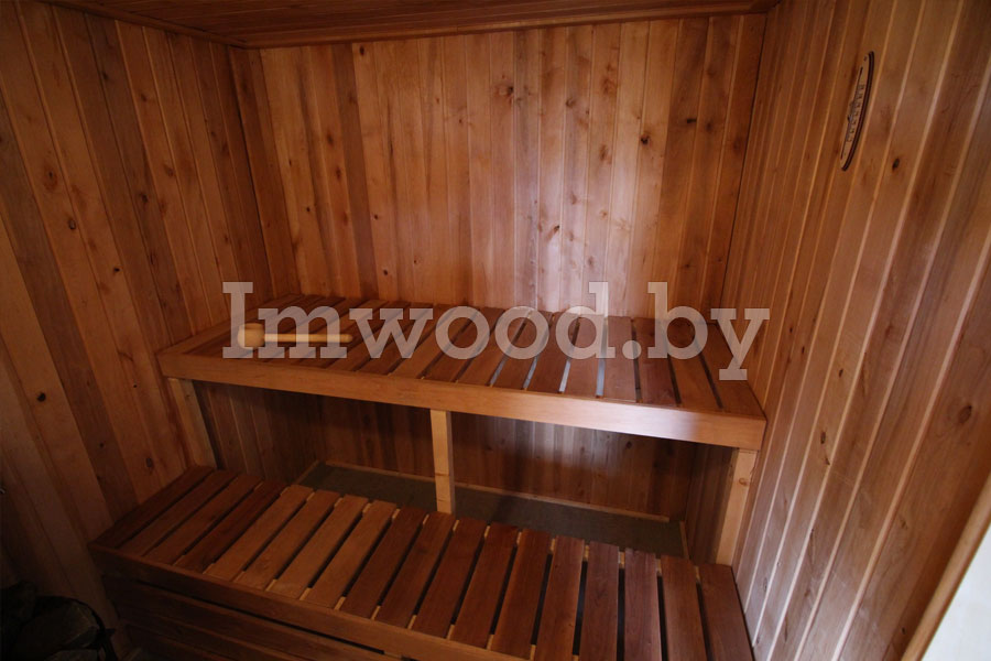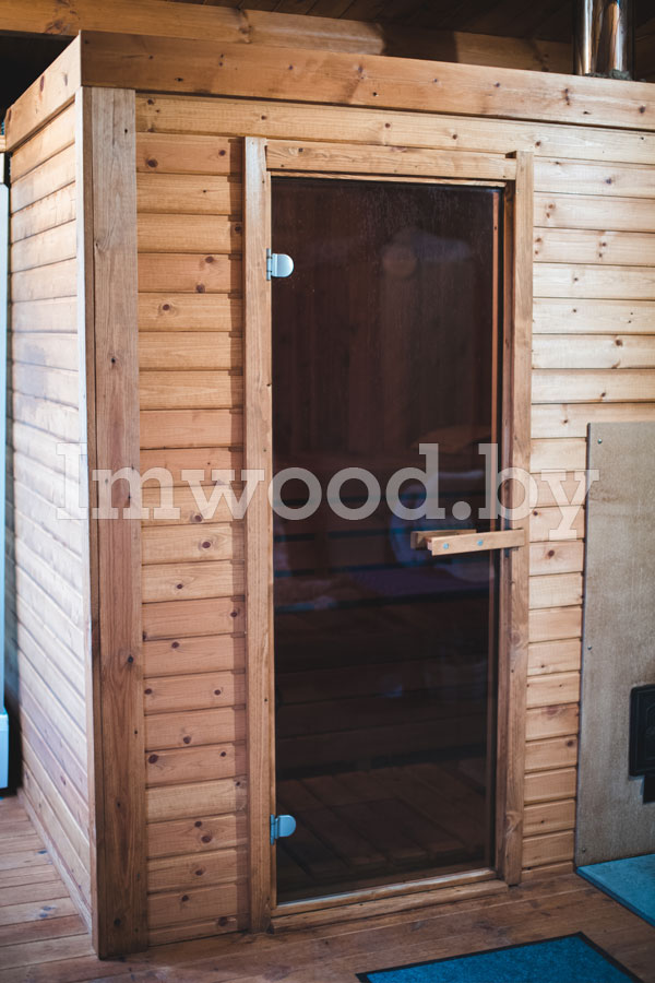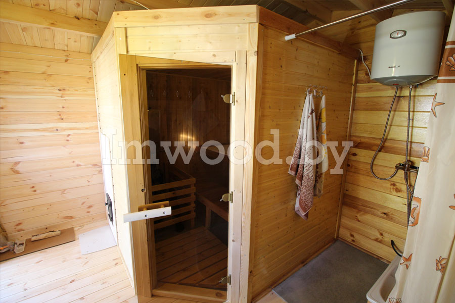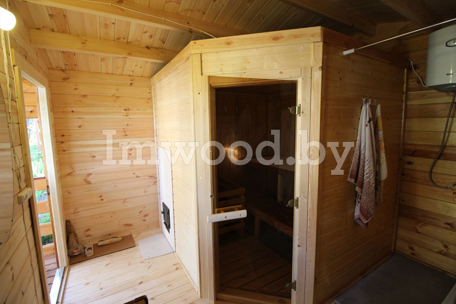 Стены бани из сухого бруса 44мм. Парная имеет дополнительные стены, изготовленные по каркасной технологии. Это позволяет максимально сохранить тепло. Толщина стен парной около 130 мм.