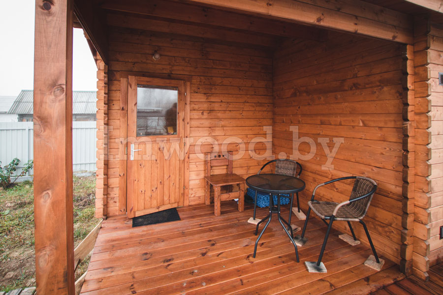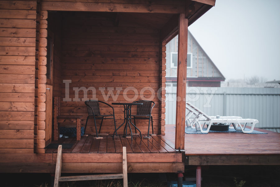 Широкие свесы крыши и крытая терраса надежно защищают стены строения от внешних воздействий в виде снега, дождя и солнца.