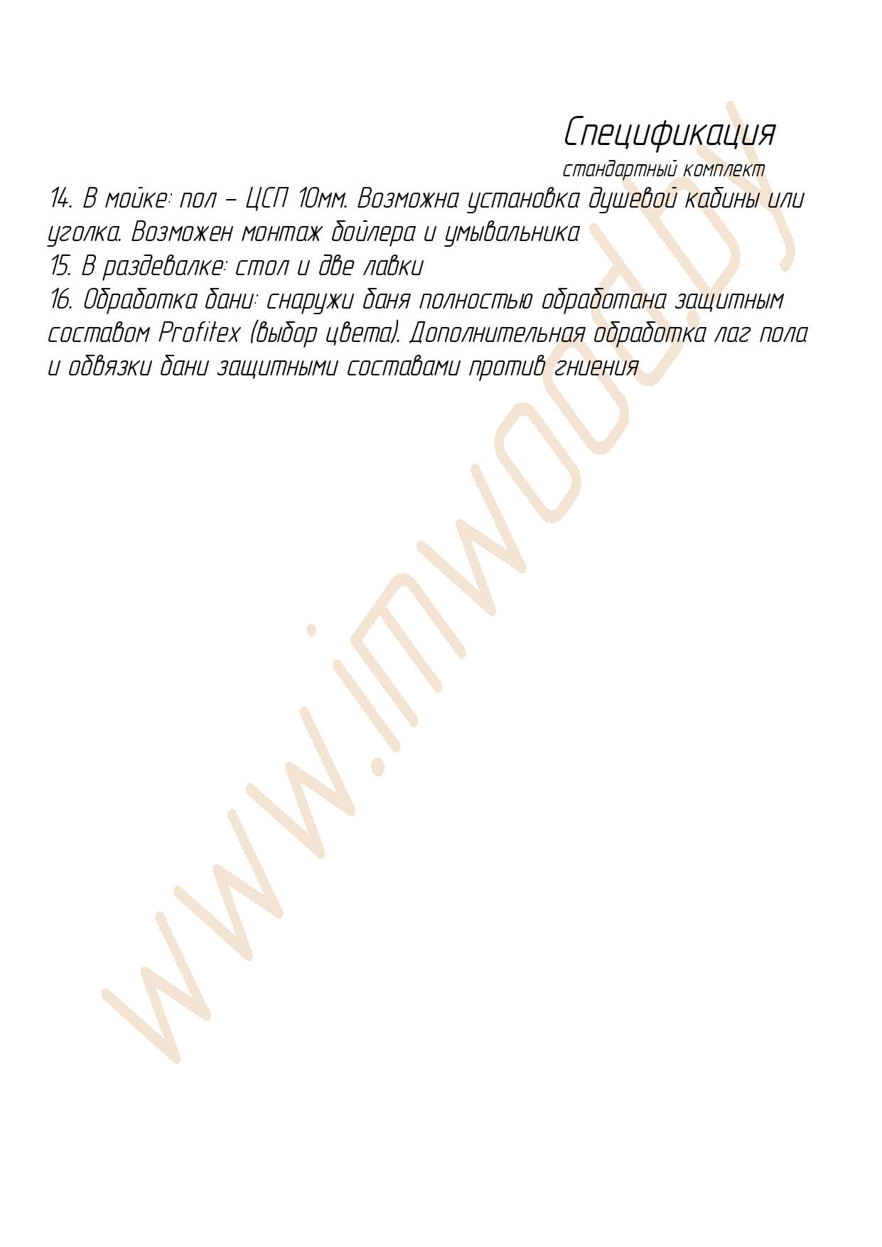 В отличии от подобных деревянных бань других производителей – онструкция пола вашего изделия, будет предусматривать укладку кафельной плитки и, как следствие, беспроблемную эксплуатацию и максимальную гигиену.