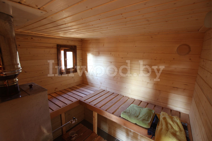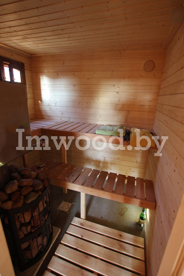 Баня выполнена из сухого профилированного бруса, а парная имеет дополнительные стены, изготовленные по каркасной технологии. Это позволяет максимально сохранить тепло. Толщина стен парной около 130 мм.