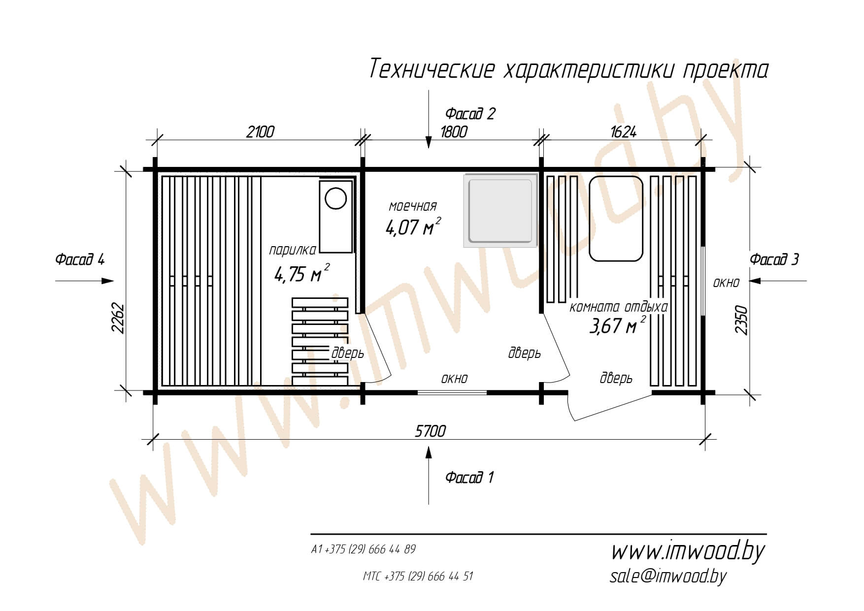 Размер и планировка помещений разработаны таким образом, чтобы позволить комфортно принимать банные процедуры, а также иметь возможность помыться и отдохнуть. Планировку помещений и их размер вы может скорректировать по собственному желанию.