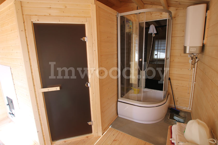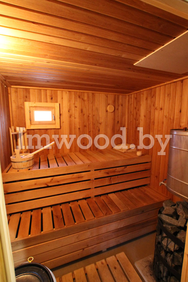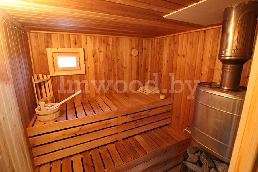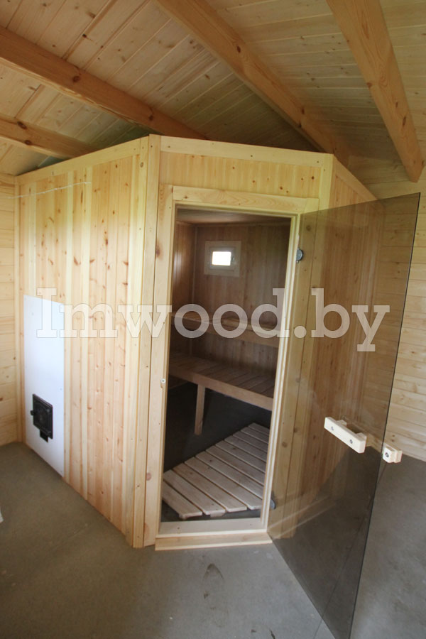 - Конструкция стен и потолка толщиной 85 мм из сборных элементов. Конструкция представляет собой каркасные элементы с изоляцией 50 мм из минеральной ваты и пароизоляцией в виде алюминиевой фольги. Снаружи и внутри облицованы профилированным деревом (вагонкой) толщиной 15 мм из ели и ольхи, сорт на выбор.