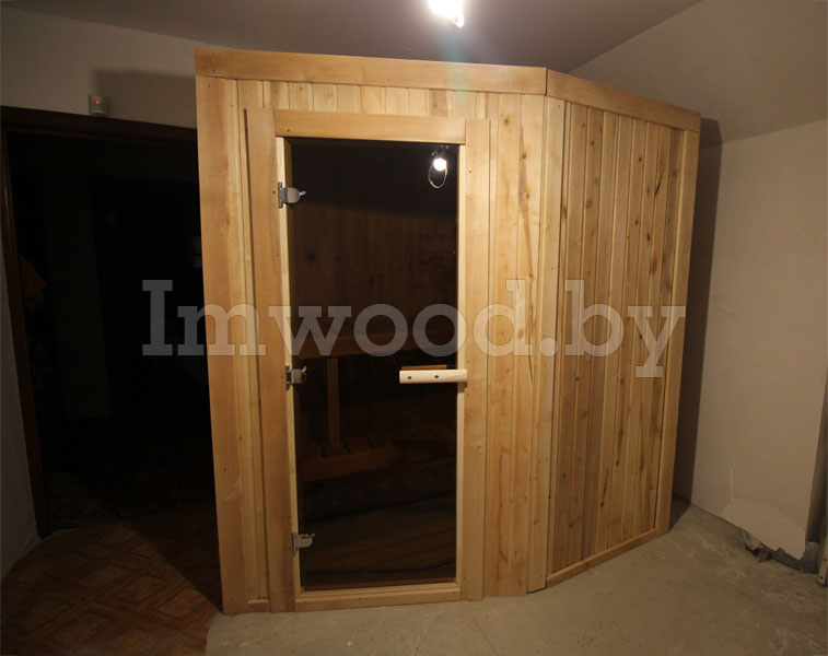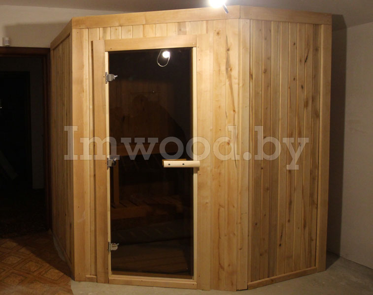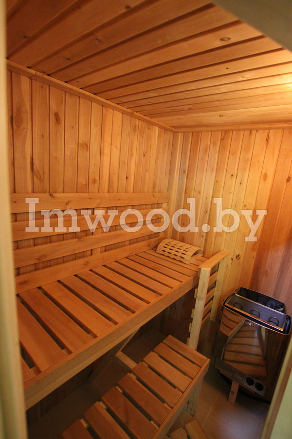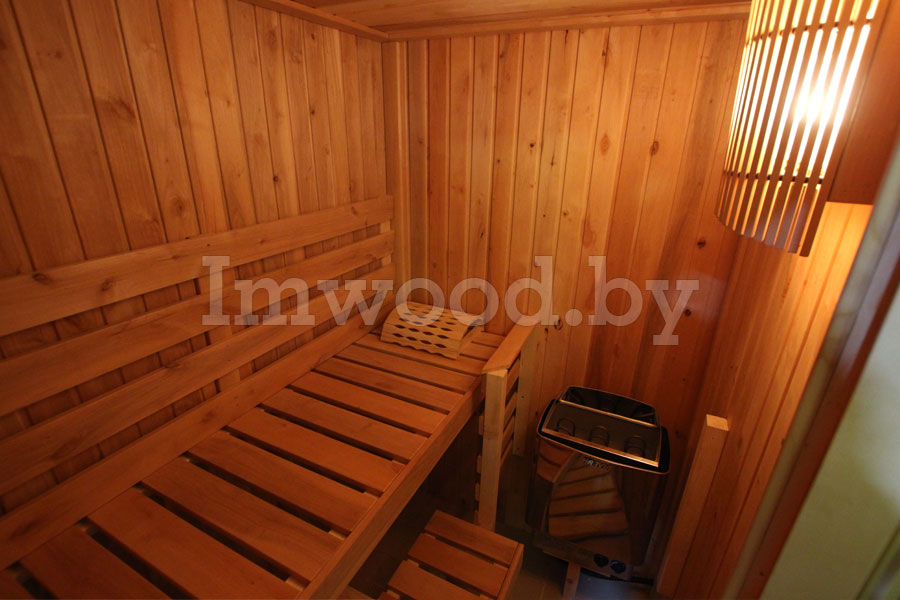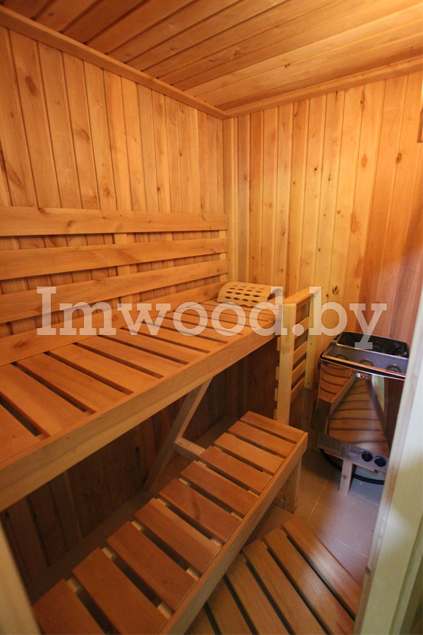 - Конструкция стен и потолка толщиной 85 мм из сборных элементов. Конструкция представляет собой каркасные элементы с изоляцией 50 мм из минеральной ваты и пароизоляцией в виде алюминиевой фольги. Снаружи и внутри облицованы профилированным деревом (вагонкой) толщиной 15 мм из ели и ольхи, сорт на выбор.