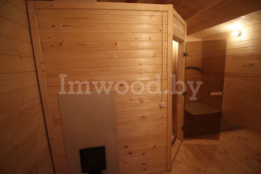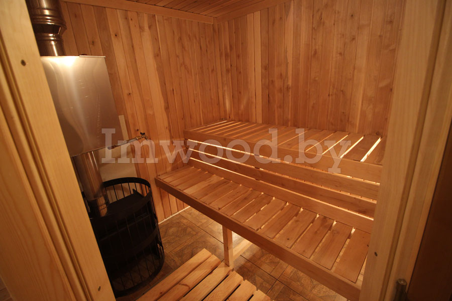 Внутри установлена печь, выполнены полки для сидения, освещение, вентиляция, напольная решетка.