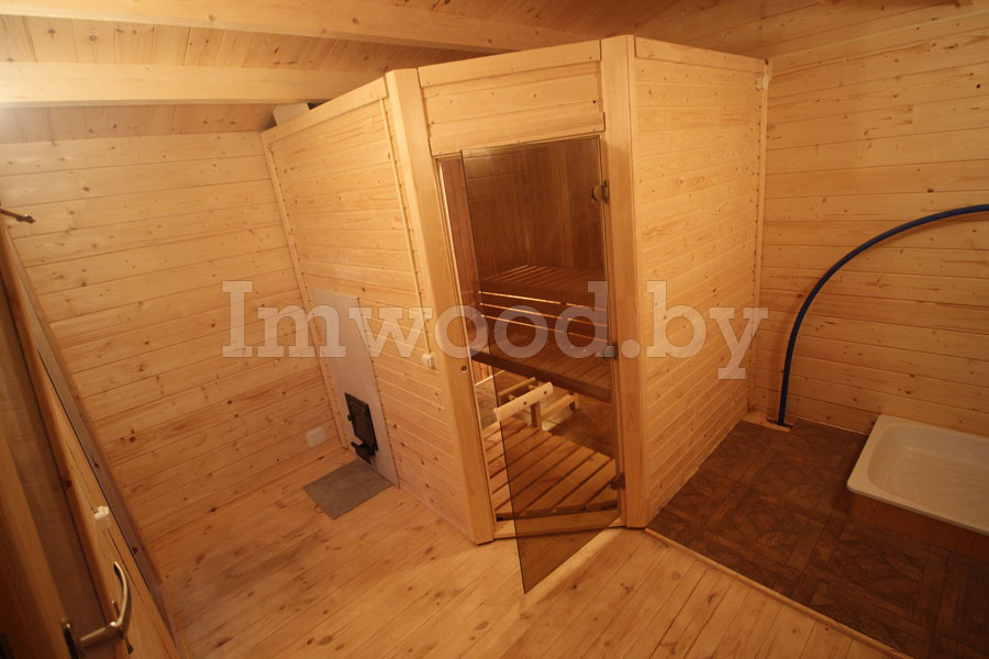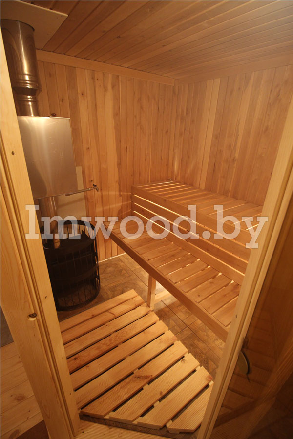 Такой вариант сауны подойдет для загородного коттеджа либо дачи. Она может быть установлена практически в любом помещении (в цокольном либо любом другом).